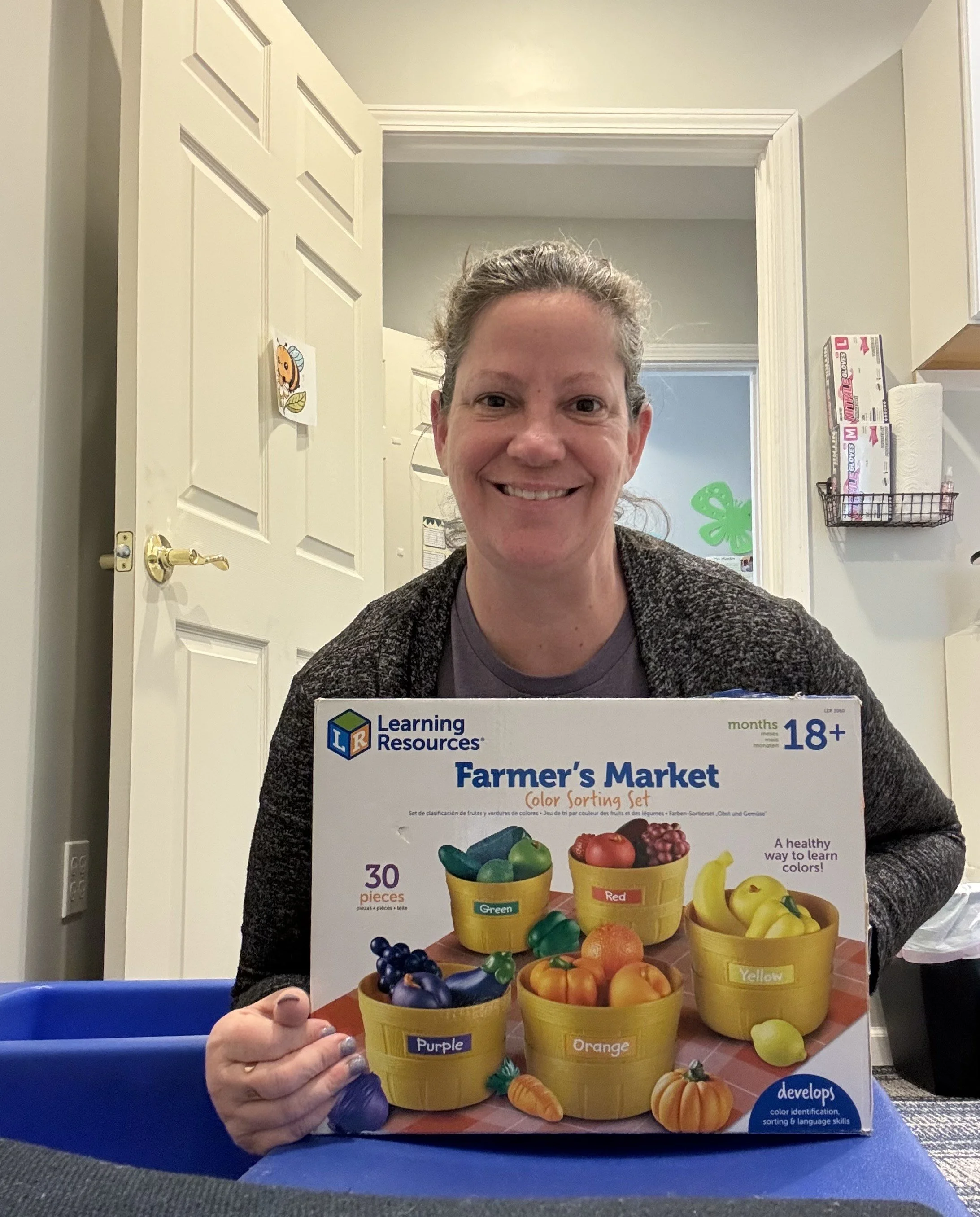 Ms. Laura loves Farmer’s Market. She enjoys meeting families at our local farmer's market. She also loves seeing kids have fun in therapy with this toy!